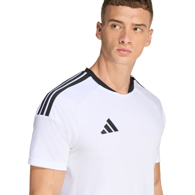 Men's adidas Tiro 26 Competition Match Jersey, Black and White, KA6167. This adidas men's jersey is perfect for football matches. It features a fitted cut, a crew neck with a subtle collar, and mesh panels. Climacool technology wicks away sweat. Recycled fibers. Heat-transfer logo. Shoulder straps. Material: 100% recycled polyester.