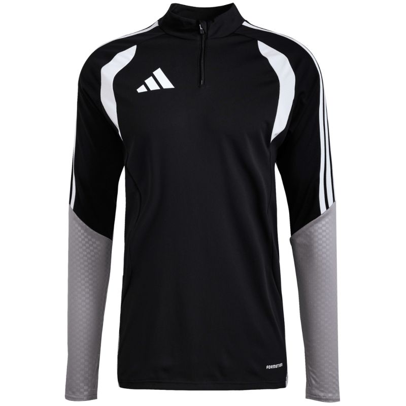 Men's adidas Tiro 26 Competition Training Top, Black JX4257. This adidas football sweatshirt for men is perfect for training. Stand-up collar. Short zipper with a protective flap. Fitted fit. Formotion technology ensures excellent mobility. Mesh inserts on the chest. Straps on the shoulders. Subtle logo on the chest. Embossed details on the sleeves and sides. Quick-drying fibers. Sleeves with thumbholes. Material: 100% recycled polyester