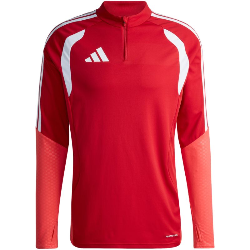 adidas Tiro 26 Competition Training Top Men's Sweatshirt, Red KA7559. This adidas football sweatshirt for men is perfect for training. Stand-up collar. Short zipper with a protective flap. Fitted fit. Formotion technology ensures excellent mobility. Mesh inserts on the chest. Straps on the shoulders. Subtle logo on the chest. Embossing on the sleeves and sides. Quick-drying fibers. Sleeves with thumbholes. Material: 100% recycled polyester