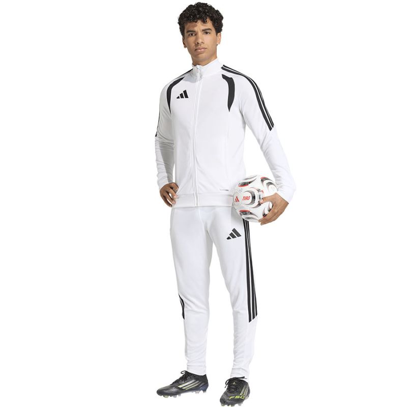 adidas Tiro 26 League Training Men's Sweatshirt, White KC1278. This adidas football sweatshirt for men is perfect for training. Stand-up collar. Full-length zipper. Slim fit. Climacoool technology absorbs and wicks away moisture. Mesh chest panels. Zippered side pockets. Chin guard. Striped sleeves. Subtle logo. Recycled fibers. Material: 100% recycled polyester