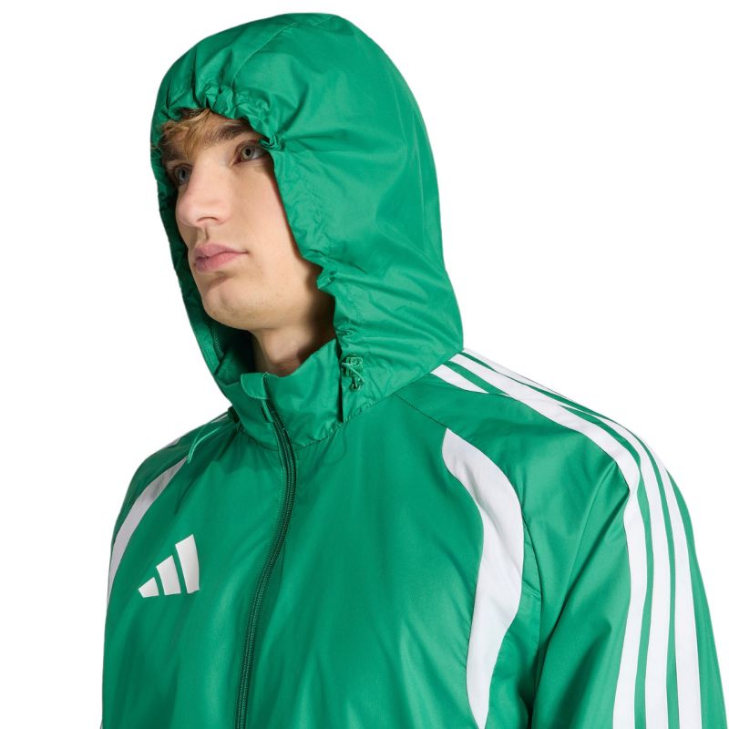 Men's adidas Tiro 26 League Windbreaker Jacket Green JY9729 This men's adidas windbreaker from the Tiro line is perfect for training. A full-length zipper allows for quick dressing. Clima365 technology. Two side zip pockets. Adjustable hood. Elastic cuffs. Standard fit. Material: 100% recycled polyester