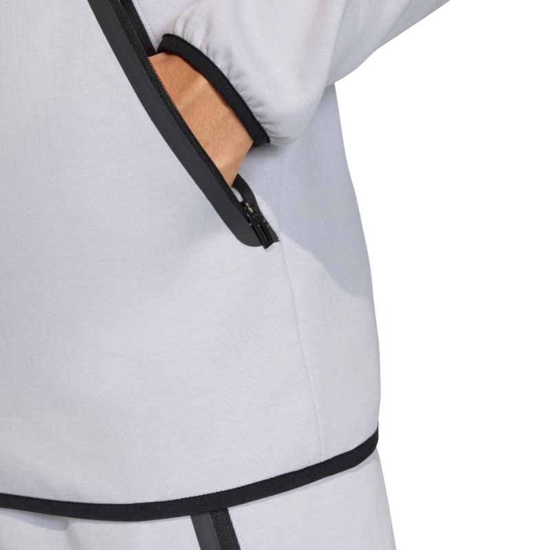 Men's adidas Tiro 26 Travel Sweat Hoodie Gray KF6077 This men's adidas sweatshirt will keep you comfortable off the pitch. This model comes from the Tiro football line. The material combines cotton and polyester fibers. A long, one-way zipper ends with a protective flap. A fitted cut finished with elastic hem. A roomy hood with an adjustable drawstring. Front, zippered pockets. Material: 75% cotton, 25% recycled polyester