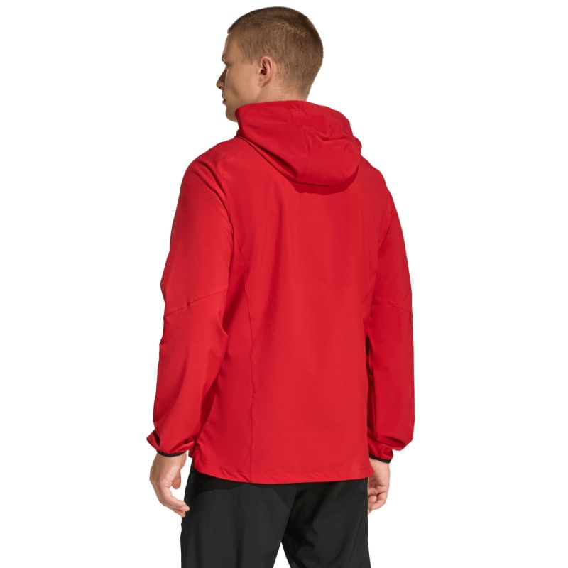 Men's adidas Tiro 26 Travel Windbreaker Jacket, Red KD3337. This men's windbreaker, inspired by adidas' football heritage, combines functionality with modern style. A simple, refined silhouette with a slim fit and ergonomic stitching allow the jacket to naturally fit your body and move freely with you. A full-length zipper and an adjustable hood. Lightweight construction made of smooth material. Subtle details with the adidas logo. This jacket is perfect for both training and everyday styling. Specifications: Material: 87% recycled polyester, 13% elastane. Slim fit. Zipper. Elastic cuffs. Hood with toggle adjustment. Zippered side pockets. Elasticated hem.