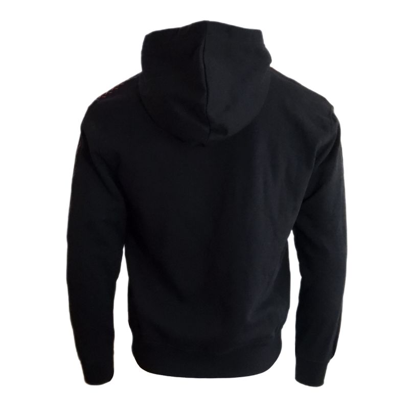 The entire piece is in black with red accents, which gives the sweatshirt a dynamic, modern look.