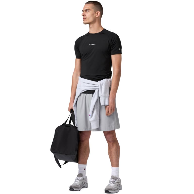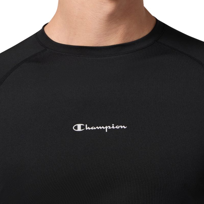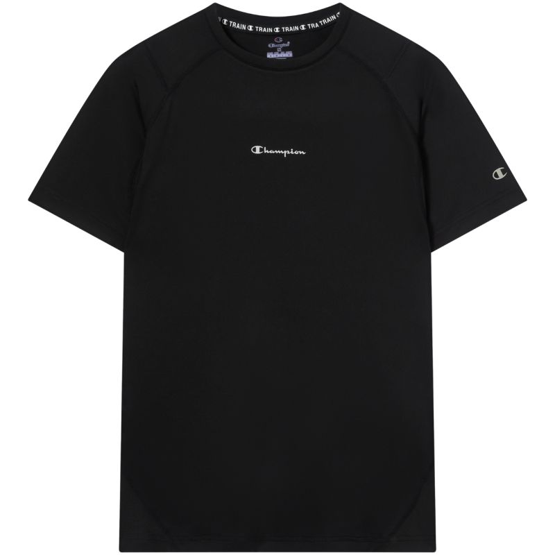 The Champion SS Tee Men's Black 221381 KK001 is a compression training tee made of stretchy fabric that conforms to your body and supports your muscles during exercise. Quick Dry technology wicks away moisture, while a breathable back panel enhances ventilation. Life Natural helps reduce odor, ensuring longer-lasting freshness. Material: 84% polyester, 16% elastane