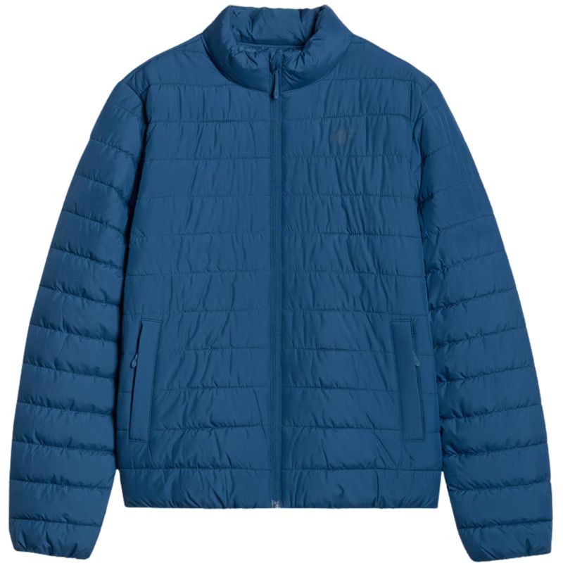 The 4F M597 Men's Down Jacket in Dark Navy 4FWAW25TDJAM597 30S is a lightweight men's jacket perfect for warmer or cloudy days during the transitional period. Its standard cut features horizontal quilting and a low stand-up collar. The outer material's hydrophobic impregnation allows moisture to bead on the fabric or knit surface and then roll off freely. Synthetic down filling is more durable and easier to care for than natural down. Even when exposed to moisture, it retains its insulating properties for a longer period and dries much faster. Technical data: Main material: 100% polyester Lining: 100% polyester Filling made of 100% recycled synthetic down, provides adequate insulation properties even in humid conditions Regular fit - comfortable fit to the body without restricting movement Standard length to the hips - universal style for everyday use Classic horizontal quilting - even distribution of fill and a stylish look Lightweight construction - comfort of wearing without unnecessary weight Hydrophobic outer coating - limits moisture absorption Rip stop fabric - increased tear resistance and durability Recycled synthetic fill - effective insulation even in humid conditions Stand-up collar - additional neck protection against cold Elasticated cuffs and hem - better fit and wind protection 2 side zip pockets - safe storage of small items Inner zip pocket - additional space for valuables Main zipper with a flap windproof - increased protection against heat loss
