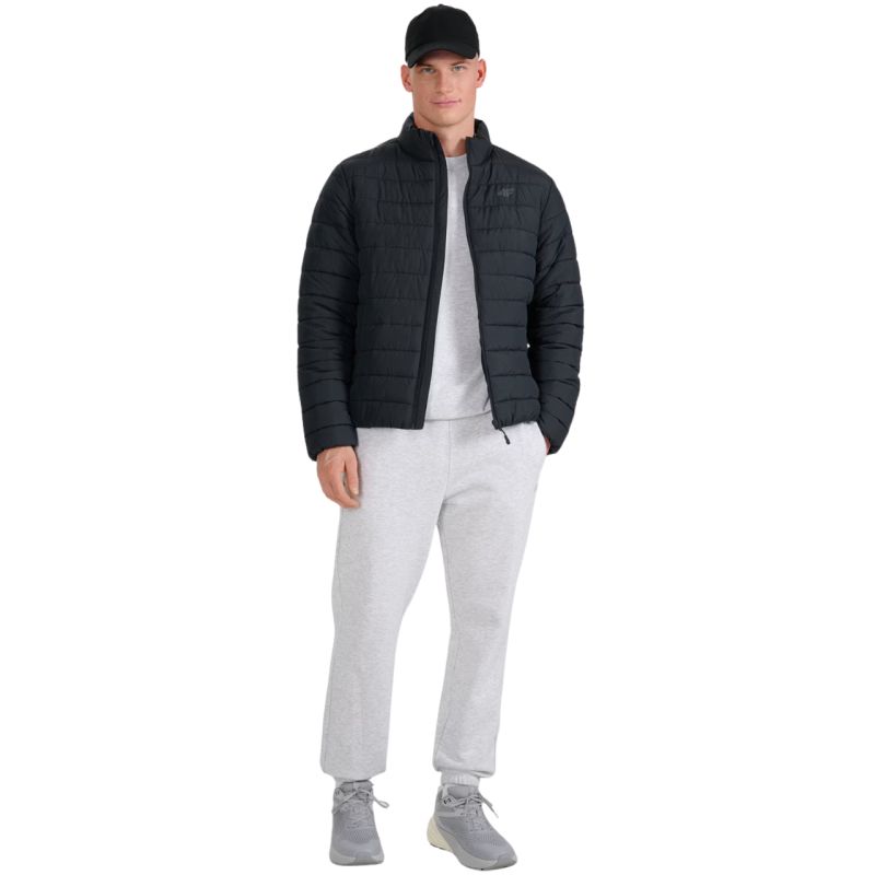 The 4F M597 Men's Down Jacket, Deep Black 4FWAW25TDJAM597 20S, is a lightweight men's jacket perfect for warmer or cloudy days during the transitional period. Its standard cut features horizontal quilting and a low stand-up collar. The outer material's hydrophobic impregnation allows moisture to bead on the fabric or knit surface and then roll off freely. Synthetic down filling is more durable and easier to care for than natural down. Even when exposed to moisture, it retains its insulating properties for longer and dries much faster. Technical data: Main material: 100% polyester Lining: 100% polyester Filling made of 100% recycled synthetic down, provides adequate insulation properties even in humid conditions Regular fit - comfortable fit to the body without restricting movement Standard length to the hips - universal style for everyday use Classic horizontal quilting - even distribution of fill and a stylish look Lightweight construction - comfort of wearing without unnecessary weight Hydrophobic outer coating - limits moisture absorption Rip stop fabric - increased tear resistance and durability Recycled synthetic fill - effective insulation even in humid conditions Stand-up collar - additional neck protection against cold Elasticated cuffs and hem - better fit and wind protection 2 side zip pockets - safe storage of small items Inner zip pocket - additional space for valuables Main zipper with a flap windproof - increased protection against heat loss