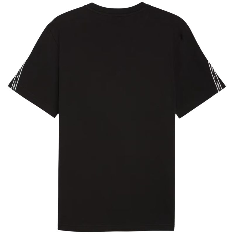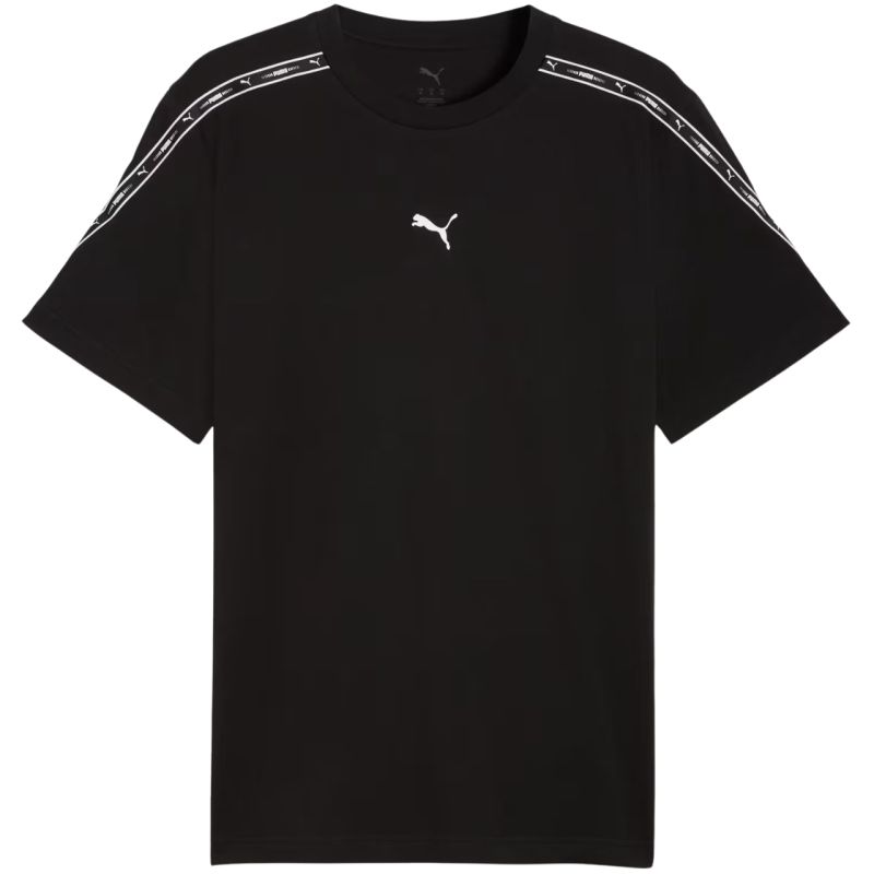 Puma Tape Tee Men's T-Shirt, Black 691693 01. This Puma men's T-shirt is perfect for everyday wear. Made of cotton, at least 20% of which is recycled. It features a standard fit, a crew neck, and short sleeves. Main fabric: 100% cotton. Rib: 80% cotton, 20% polyester.