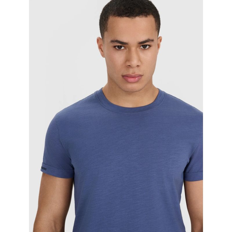 Everyday comfort is enhanced by a round neckline with light ribbed detailing and rolled-up sleeves with printed details , which lend a modern touch to the overall look. This model is for men seeking a simple design, comfortable material, and timeless style.