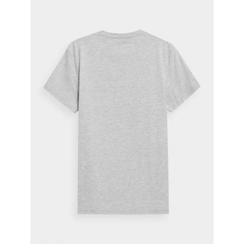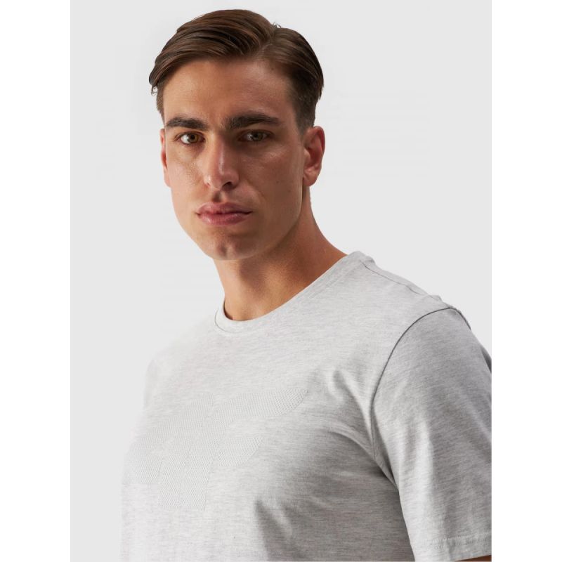 This men's short-sleeved T-shirt, with its 180 gsm weight, is soft to the touch and drapes well. It's non-sheer and provides durability and comfort for year-round wear. The 4F men's T-shirt is made of 100% cotton, making it soft, durable, and pleasant to the touch. The crew neckline is finished with a light ribbed trim. A 4F print is visible on the front.