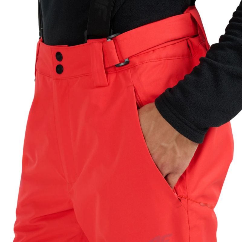 Men's ski pants 4F FNK M1155 red 4FWAW25TFTRM1155 62S Men's ski pants 4F will work well in changeable weather conditions, ensuring full freedom of movement. Technical data: Main material: 100% polyester Additional material: 100% polyester Lining: 100% polyester Filling: 100% polyester (polyester insulation) Membrane waterproofness level: 5,000 mm Membrane breathability level: 3,000 g 4F NeoDry 5000/3000 membrane - ensures waterproofness and breathability, protecting against light rain and snow Hydrophobic impregnation - protects the material against moisture absorption Taped seams - protects against moisture penetration Polyester insulation - ensures optimal thermal comfort without excessive load Fastened, adjustable belt - combines a zipper, Velcro and press studs fastening and Velcro adjustment for a comfortable fit Detachable, adjustable suspenders - allow for individual adjustment and the possibility of quick removal Ventilation on the thighs - system with Zippers on the inner thighs support thermoregulation during intense movement. Reinforcements at the bottom of the legs - increase durability in areas prone to damage. 2 side zippered pockets - protect small items during activity. Pre-shaped knees - improve freedom of movement on the slope. Inner snow gaiters - effectively protect against snow getting inside. Side zippers at the bottom of the legs - make it easier to put on over ski boots. Reflective elements - increase visibility. Smooth lining - ensures comfort and easy dressing. Regular fit - comfortably adapts to the body, does not restrict movement. Full-length legs - reach below the ankle and protect the legs along their entire length. Mid-rise - for a comfortable fit at the waist.