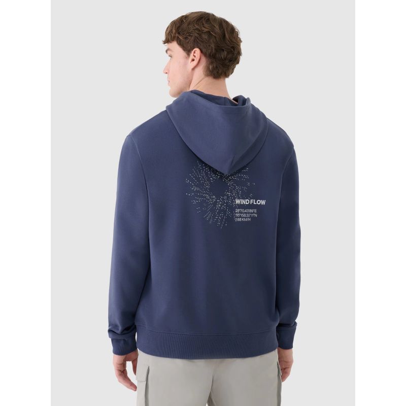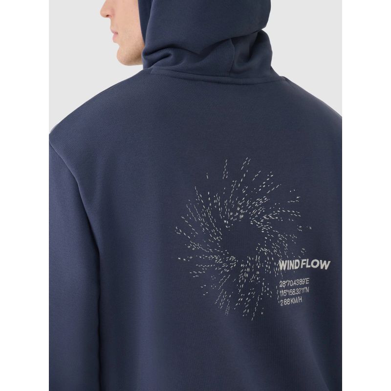 This model features a regular fit that comfortably conforms to the body without restricting movement. The interior is made of French terry fabric, making it breathable and comfortable for everyday wear. The integrated hood , elastic cuffs, and a practical kangaroo pocket enhance functionality and comfort. A "Wind Flow" print is visible on the back, giving the piece a sporty character.
