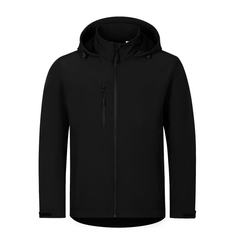 Softshell: 96% polyester, 4% elastane, 100D, 4-Way Stretch, water-repellent finish, inner side: 100% polyester - microfleece, anti-pilling finish without label - ready for rebranding, 2-layer softshell, straight cut with side panels, full-length reverse-zip front zipper with chin guard, elastic hood with drawstring and drawstring at bottom, back hem label in neutral size, adjustable sleeve hems with Velcro, pockets with reverse-spiral zipper, chest pocket, slightly extended at the back, inner fleece with anti-pilling finish