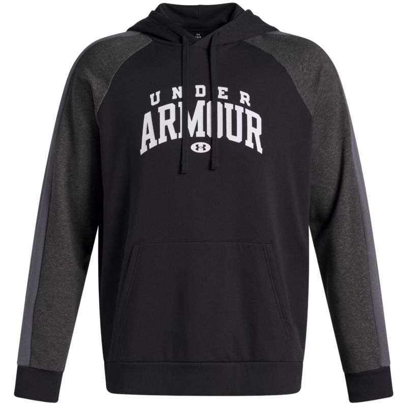 Men's Under Armour Rival Fleece Colorblock Hoodie Black 6003958 001 This Under Armour men's hoodie is perfect for everyday wear and active wear. Relaxed fit. Fixed, adjustable hood. Insulated interior. Ribbed cuffs and hem. Front pocket. Large logo. Material: 80% cotton, 20% polyester