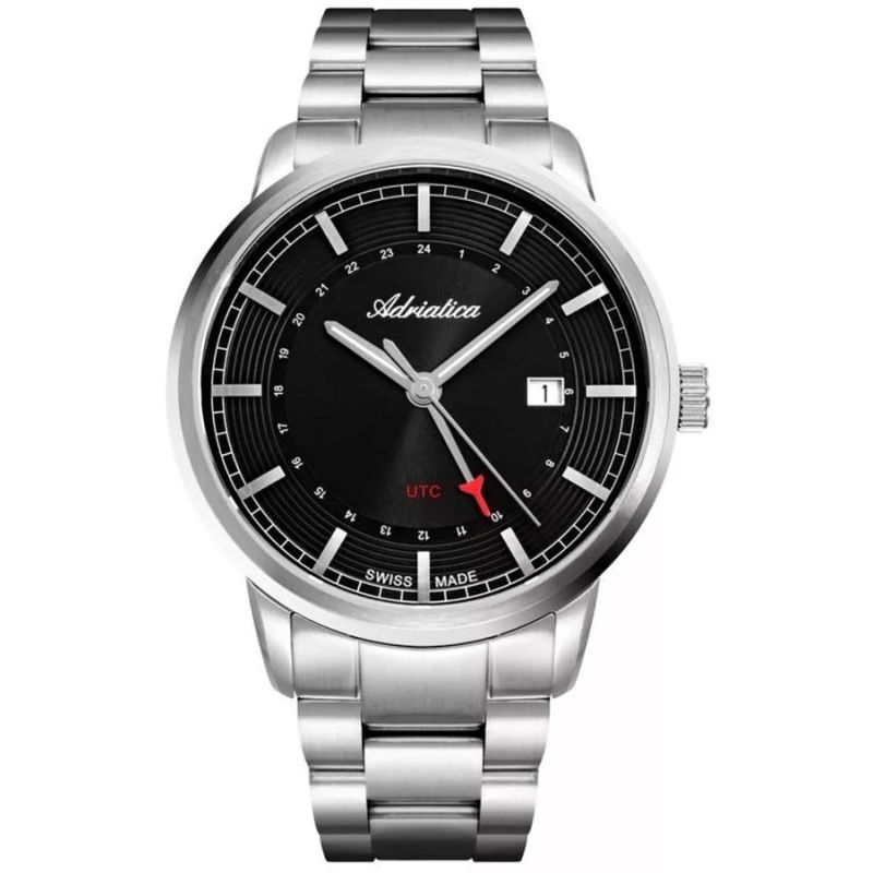 The Adriatica A8307.5114Q men's watch is the essence of modern elegance, captured in a deep black that captivates with its refined minimalism and expressive power. Its black dial, with a refined matte finish, is enhanced by a subtle 24-hour bezel, lending the watch functional depth and distinctive structure. This model features four hands – including an additional GMT with a red tip – allowing simultaneous tracking of the time in a second time zone or in 24-hour mode. This practical yet aesthetic solution highlights a dynamic, masculine lifestyle. The main hands and hour markers are coated with a luminescent layer , ensuring excellent readability regardless of the time of day. A harmoniously integrated date display at 3 o'clock provides practical functionality without disrupting the symmetry of the dial. The entire watch is protected by high-quality , scratch-resistant sapphire crystal – a solution appreciated by anyone who values durability and aesthetics. The watch case and the massive, satin-finished steel bracelet create a coherent and expressive form.