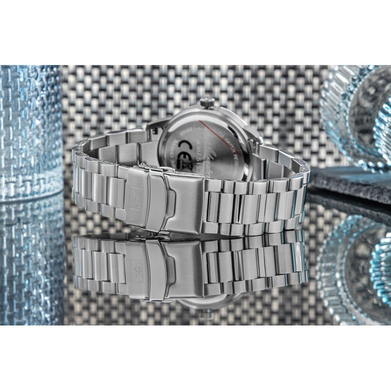 Crafted from premium stainless steel, it combines durability with a luxurious finish. Its robust construction not only guarantees reliability but also ensures that the watch will fit perfectly, no matter what the day brings. A precise clasp with an embossed logo completes the look, adding a touch of class and unique character.