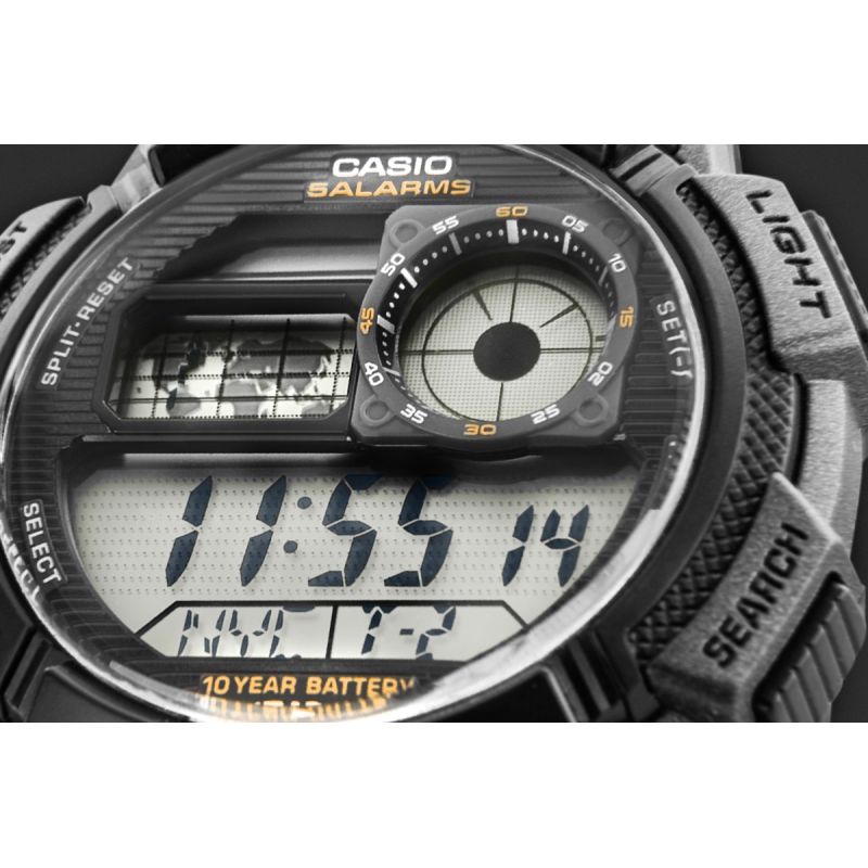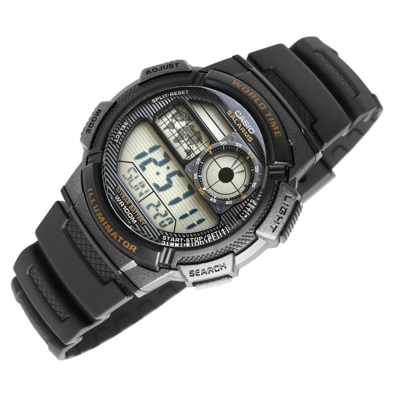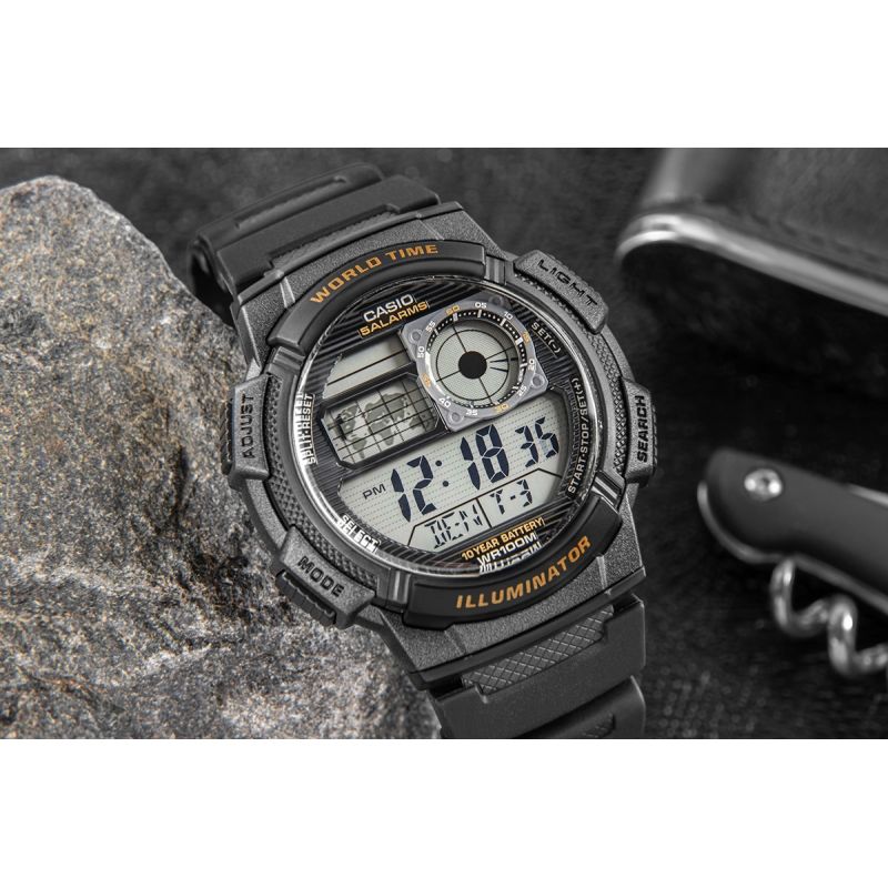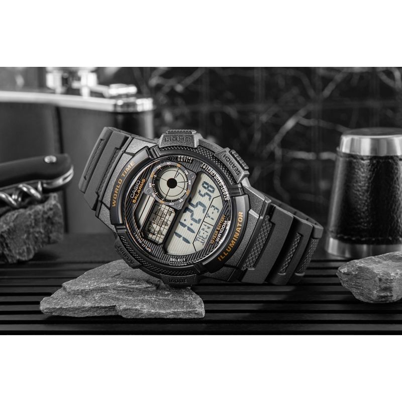 This CASIO model features Multi Time, world time, stopwatch, 5x alarm, and countdown timer – all for 10 years on a single battery. The Casio AE-1000W is a watch that keeps up with you – its cockpit-inspired dial gives it a rugged, technical character that emphasizes masculine style and a dynamic lifestyle. The world map and World Time function allow you to check the time in different time zones at a glance, making it an ideal choice for travelers and professionals working internationally. The LC Analog display means you always have the time of your home city at your fingertips, while water resistance to 100 meters allows for comfortable use in more challenging conditions. This is a watch for men who expect more – precision, durability, and style.