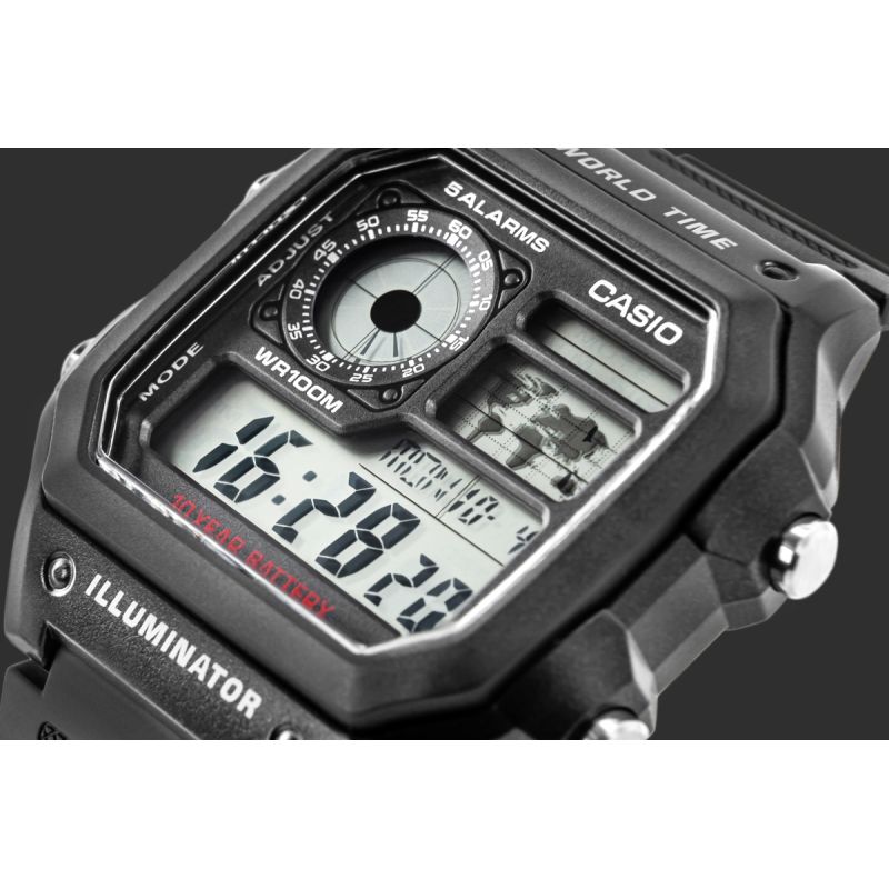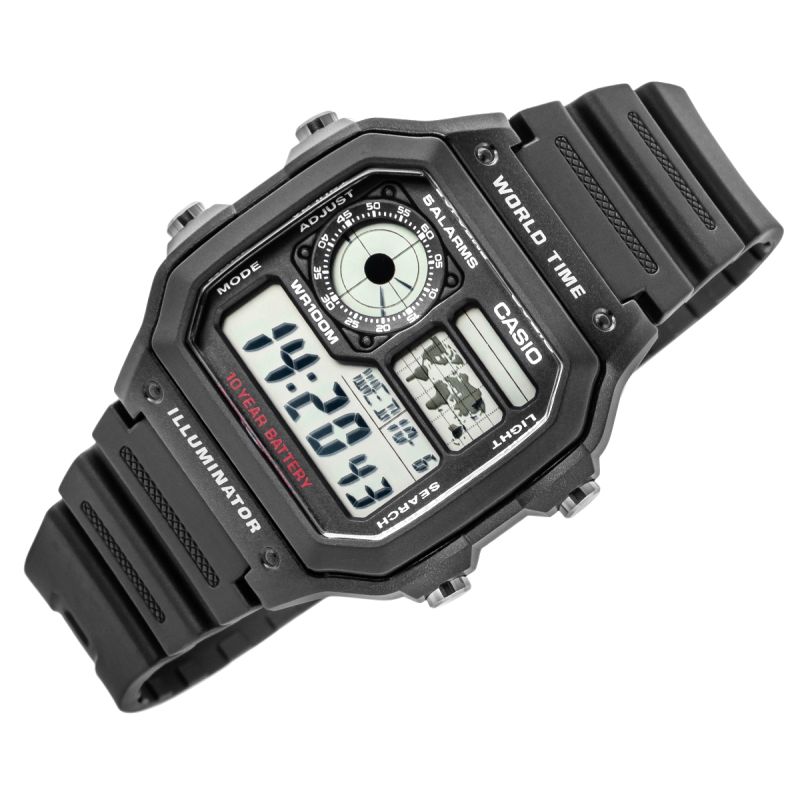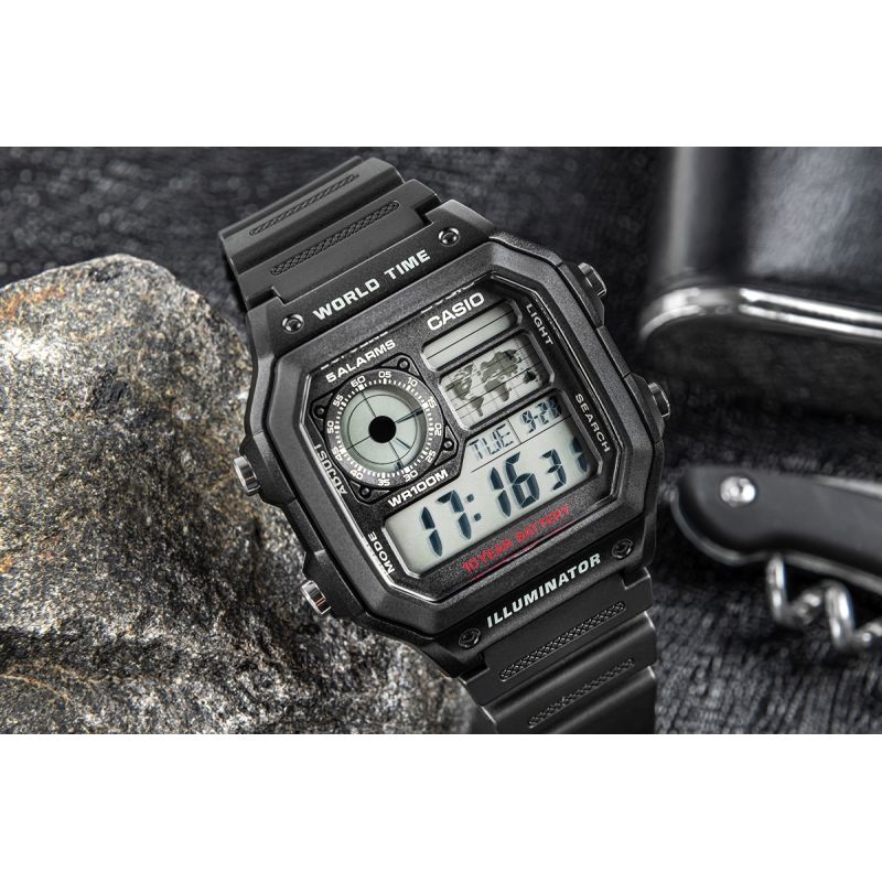 The Casio AE-1200WH-1AVDF is a men's digital watch from the iconic Casio Collection , which uniquely combines military style and retro design with modern technology. A solid plastic case, Haselite crystal , and a durable plastic strap create a lightweight yet incredibly comfortable design, perfect for everyday wear and travel. The dark green color scheme with black accents and a rectangular LCD dial with a world map give the watch a distinctive, adventurous, vintage-inspired look. This model features a world time function , five daily alarms , a 1/100th-second stopwatch , a countdown timer , an automatic calendar , and an LED backlight with adjustable brightness. Powered by a 10-year battery, it also offers 100-meter water resistance , making it perfect for both the urban jungle and the outdoors. Casio is a watch for men who value reliability, functionality, and timeless design with a hint of adventure .