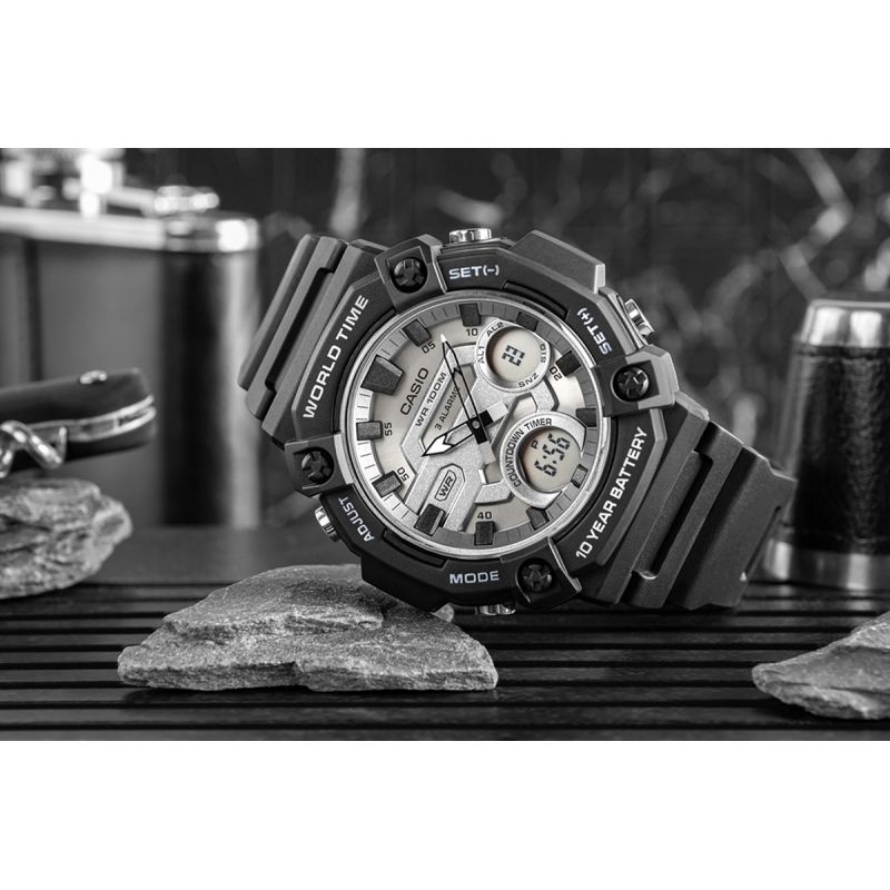 Combine functionality with adventure-readiness with the CASIO AEQ-120W watch, featuring a distinctive, robust design and oversized case. The large bezel and convex dial ensure excellent readability and emphasize the watch's masculine, decisive character. Water resistance to 100 meters and a battery life of up to 10 years guarantee reliability. Additional features such as three alarms, a timer, and a world time keep you in control of your day—no matter where you are. TELEMEMO (30 entries) is a practical solution that allows you to store important contacts without having to use your phone, which is especially useful in emergencies or during outdoor activities. Additionally, this function offers a screen informing about available memory and automatic sorting of saved data.
