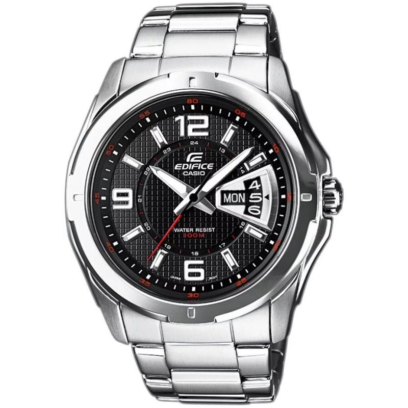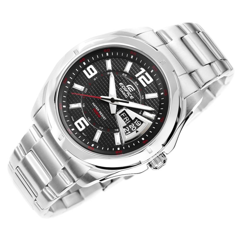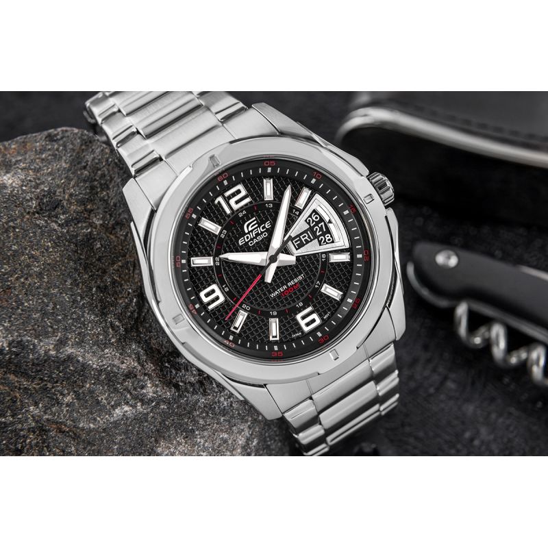 By choosing this CASIO EDIFICE model, you gain a top-of-the-line men's watch that meets the highest expectations. The modern layout, with a fluted black dial complemented by a date display and red details, highlights the watch's dynamic character, combining functionality with a unique design. 10-bar water resistance allows for freedom in the water, while fluorescent backlighting ensures visibility even after dark. The EDIFICE logo is embossed on the crown, case back, and clasp.