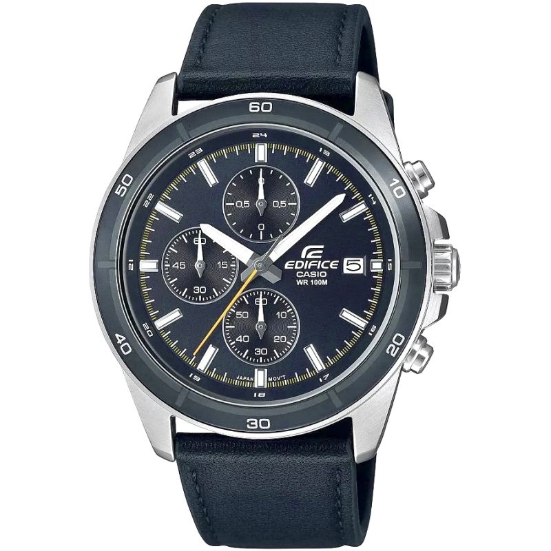 Choose the perfect blend of style and functionality with the classic, mid-sized EDIFICE chronograph. The genuine leather strap complements the dark gray dial, inspired by a dynamic urban lifestyle. This model features a date and day function, as well as chronograph functions: 1/10th-second stopwatch, seconds, and minutes. Water resistance to 10 bar allows you to confidently take it to the pool, workout, or any water adventure. A fluorescent backlight ensures you have full control of the time even after dark.