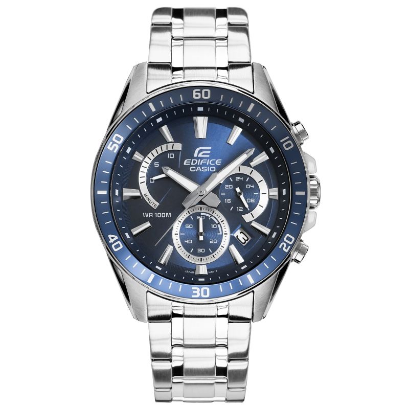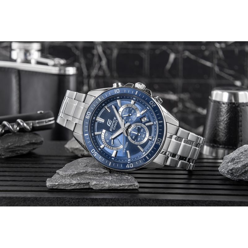 A large, standard EDIFICE chronograph with a retrograde dial at 10 o'clock. The bezel, indices, hands, and part of the subdial are finished in a sporty shade of blue, giving the watch a dynamic and modern look. Equipped with a date function and chronographs: stopwatch seconds, minutes, and a 24-hour chronograph. With 10 bar water resistance, you can confidently take it to the pool, workout, or water adventures, while the fluorescent backlight ensures you have full control of the time even after dark.