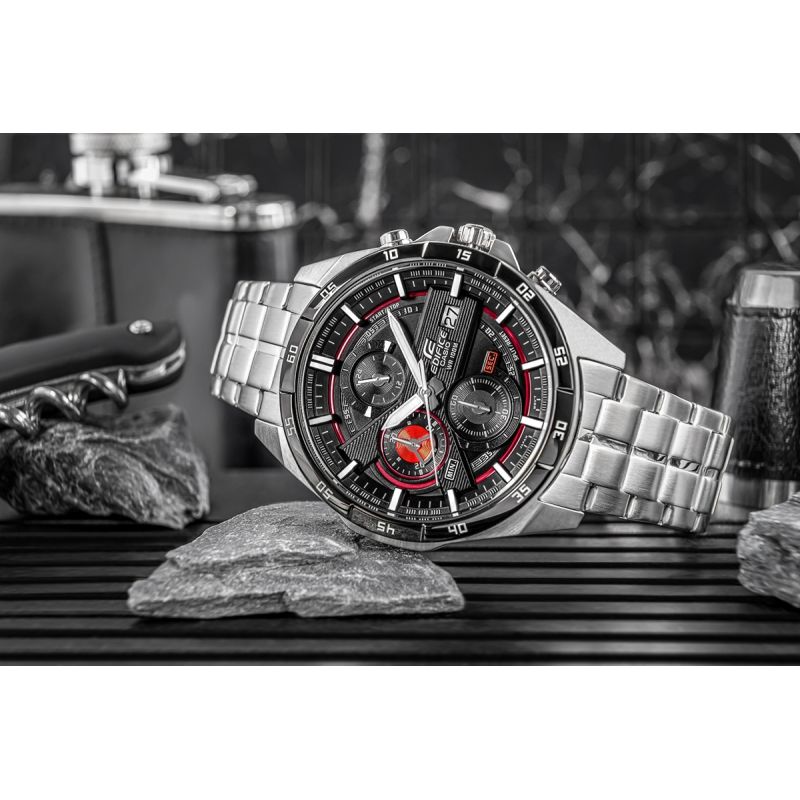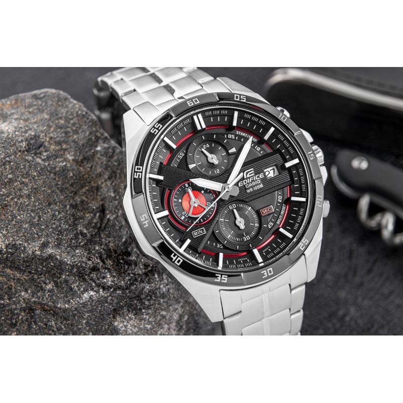 A large, standard EDIFICE chronograph. Its main feature is the dynamic design of the two-layer, three-dimensional dial. The combination of black with red metallic details on the dial gives the watch an elegant yet sporty character. It features a date function and chronographs: stopwatch seconds, minutes, and a 24-hour chronograph. Thanks to its 10 bar water resistance, you can confidently take it to the pool, workout, or water adventures, while the fluorescent backlight ensures you have full control of the time even after dark.