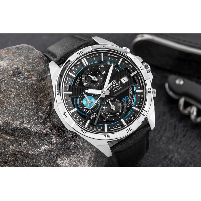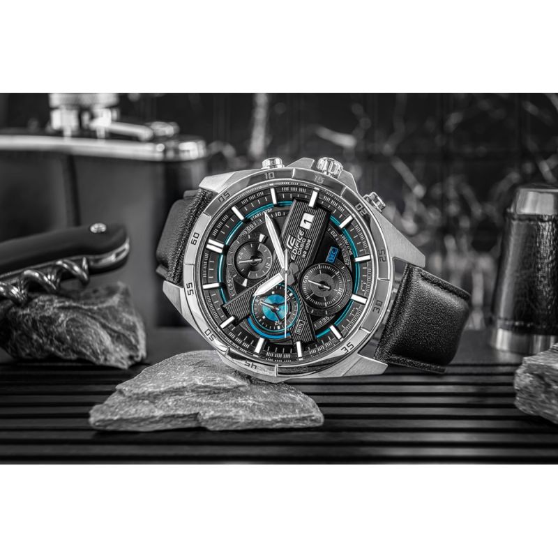 A large, standard EDIFICE chronograph. Its main feature is the dynamic design of the two-layer, three-dimensional dial. The combination of black with blue metallic details on the dial gives the watch an elegant yet sporty character. It features a date function and chronographs: stopwatch seconds, minutes, and a 24-hour chronograph. Thanks to its 10 bar water resistance, you can confidently take it to the pool, workout, or water adventures, while the fluorescent backlight ensures you have full control of the time even after dark.