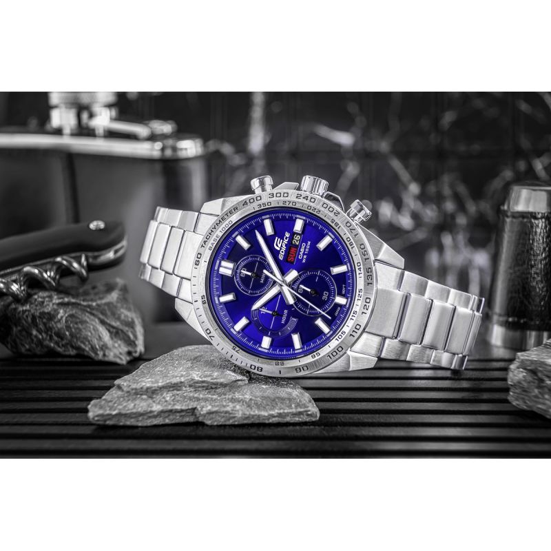 Opt for a dynamic, bold style – the classic EDIFICE chronograph is designed with a sporty character in mind. The elegantly finished, deep blue dial gives the watch a distinctive character. The day and date display adds practicality, making the watch not only stylish but also functional for everyday use. With 10 bar water resistance, you can confidently take it to the pool, workout, or water adventures, while fluorescent elements ensure you have full control over the time even after dark.