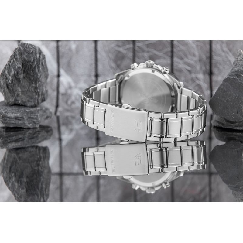 A comfortable steel bracelet is the perfect complement to this watch. This type of bracelet guarantees durability and comfort during everyday wear. The comfort is further enhanced by the high-quality steel, which comfortably fits a man's wrist. The clasp is signed with the Edifice logo, enhancing the watch's prestige and ensuring its uniqueness among other watch brands.