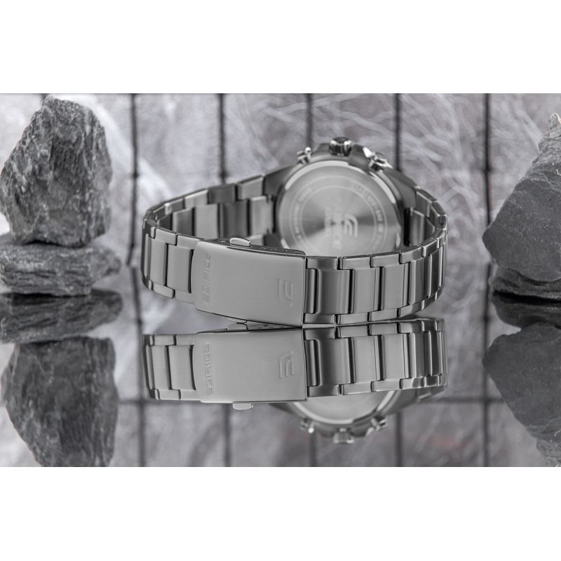 A comfortable steel bracelet is the perfect complement to this watch. This type of bracelet guarantees durability and comfort during everyday wear. The comfort is further enhanced by the high-quality steel, which comfortably fits a man's wrist. The clasp is signed with the Edifice logo, enhancing the watch's prestige and ensuring its uniqueness among other watch brands.