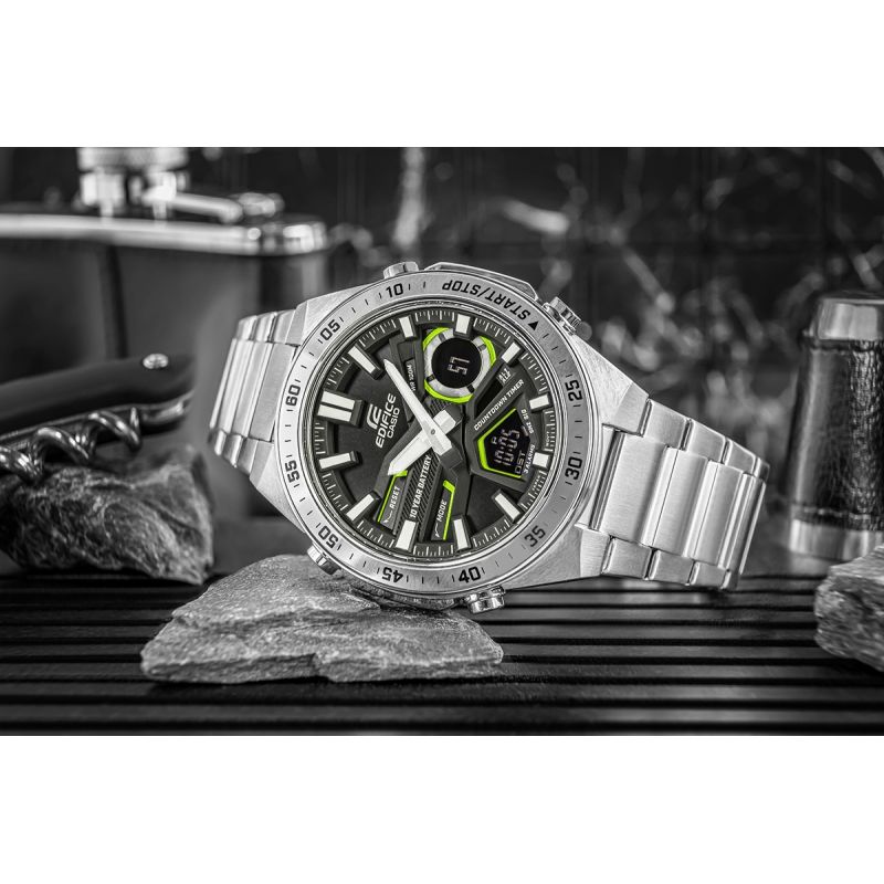 A versatile watch for active and demanding individuals . The EDIFICE EFV-C110 analog-digital timepiece provides precision and functionality for years to come – a 10-year battery means you can forget about replacing it for a long time. The dynamic, sporty design is emphasized by the depth and three-dimensionality of the dial, while the digital displays offer a wide range of functions, including world time, a 1/100th-second stopwatch, and a countdown timer. This model also features Telememo, which allows you to store 30 phone numbers , up to 12 digits long, with a name up to 8 characters long. Focus on life and choose the EDIFICE EFV-C110 – a watch that won't let you down.
