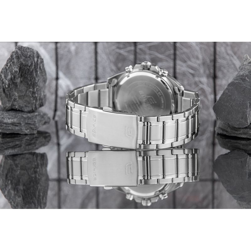 A comfortable steel bracelet is the perfect complement to this watch. This type of bracelet guarantees durability and comfort during everyday wear. The comfort is further enhanced by the high-quality steel, which comfortably fits a man's wrist. The clasp is signed with the Edifice logo, enhancing the watch's prestige and ensuring its uniqueness among other watch brands.