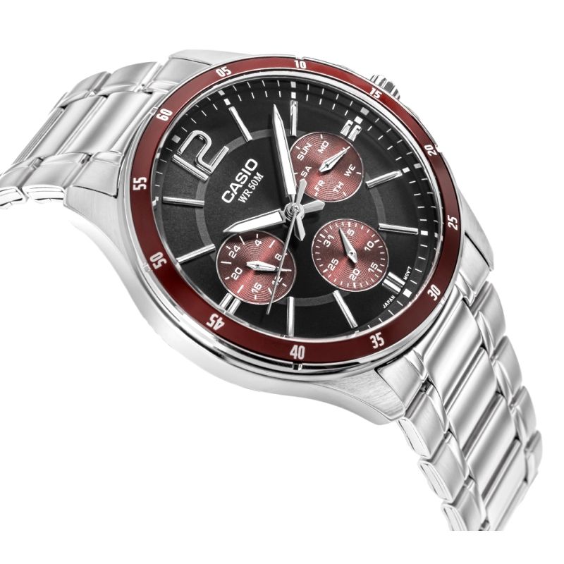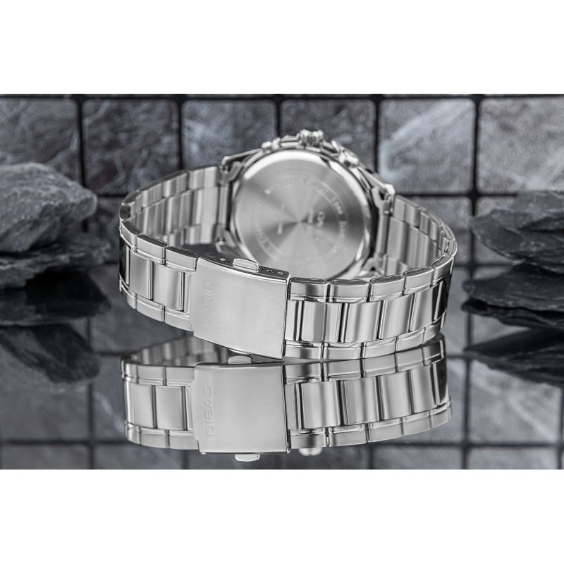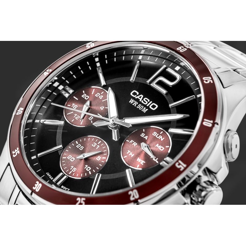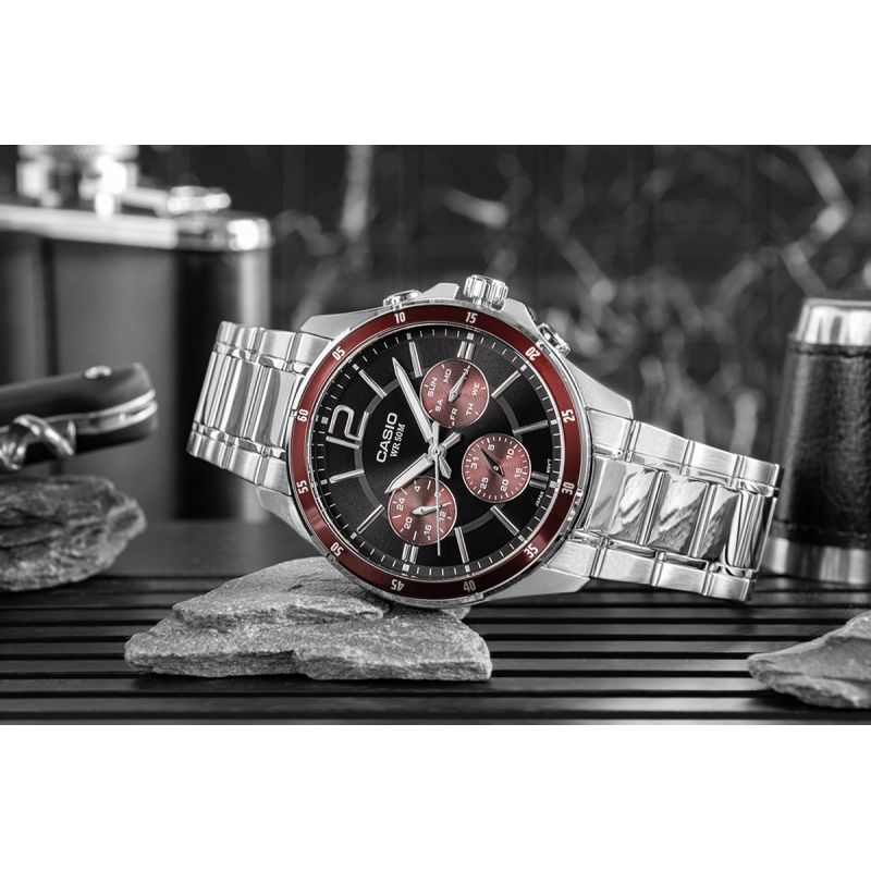 The CASIO MTP-1374D-5AVDF is more than just a watch – it's a reliable partner for the man who wants to look stylish in every situation. Its elegant design with a touch of sportiness makes it look great with both a shirt and an everyday T-shirt. The black dial with silver and red accents is eye-catching, while the ion-plated steel case and bracelet ensure durability and scratch resistance. Practical subdials – day, date, and 24-hour time – allow you to keep track of everything at a glance. The precise movement (±20 seconds/month) and water resistance to 50 meters mean you can wear it with confidence – at work, on the go, even in the rain. This is a classic metal analog watch that not only looks good but also performs when you need it.