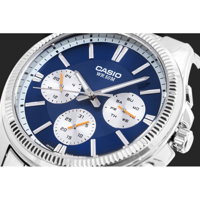 The CASIO MTP-1375D-2A1VDF is a classic analog watch with a metal bezel and a navy blue dial. The classic steel construction with ion plating guarantees durability and resistance to everyday wear, while elegant silver details add character to any outfit – from a suit to jeans. Subdials displaying the day of the week, date, and 24-hour time give you a complete overview at a glance, without having to reach for your phone. Water resistance to 50 meters and the movement's accuracy (±20 seconds per month) provide peace of mind – you don't have to worry about the weather, accidental splashes, or delays. The overall effect creates a distinctive, masculine style that attracts attention and makes the watch look well above its price point.