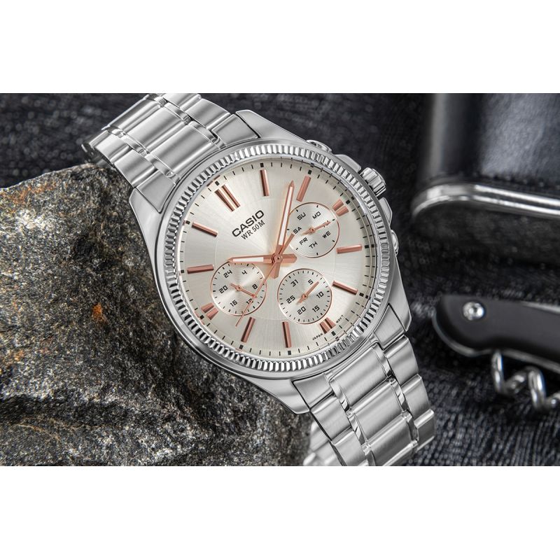 The CASIO MTP-1375D-7A2VDF is a watch for the man who likes to have everything under control – style, time, and quality. The classic steel construction with ion plating guarantees durability and resistance to everyday challenges, while the dial with elegant silver accents adds character to any outfit – from a suit to jeans. Subdials displaying the day of the week, date, and 24-hour time give you the full picture at a glance, without reaching for your phone. Water resistance to 50 meters and the movement's accuracy (±20 seconds per month) provide peace of mind – you don't have to worry about the weather, accidental splashes, or delays. The overall effect creates a distinctive, masculine style that attracts attention and makes the watch look well above its price point.