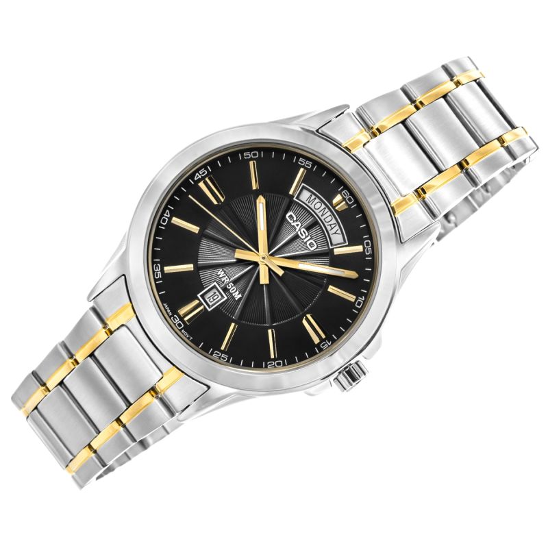 The Casio MTP-1381G-1AVDF is a watch for the man who appreciates classic style but isn't afraid of bold accents. A steel case and bracelet in an elegant two-tone finish (silver and gold) frame a deep, black dial with a textured finish that adds depth. This model not only looks exceptional but also offers practical features: the date and day indicators are discreetly integrated into the dial, maintaining its aesthetic harmony. Luminescent hands ensure readability in the dark, while water resistance to 50 meters ensures comfort in everyday use.
