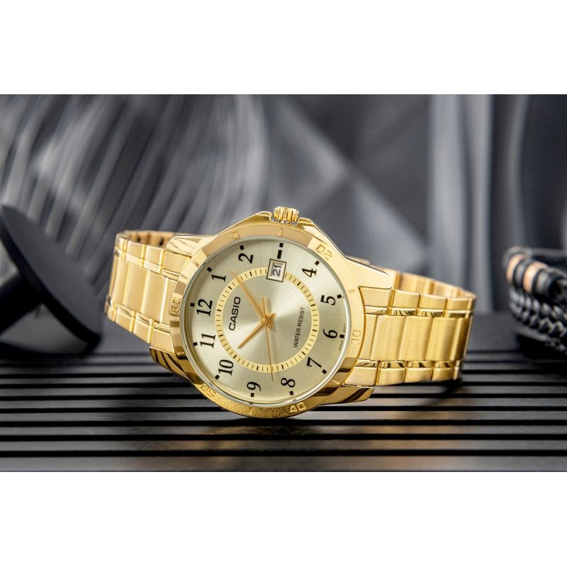 This men's model from the CASIO collection features a classic 40mm case and stainless steel bracelet, both coated with a durable gold-tone ion plating. The bright dial with clear, black Arabic numerals ensures excellent readability, while an additional minute scale in the inner ring facilitates timekeeping. A practical date display at 3 o'clock allows for a quick glance at the current day of the month. Water resistance (WR) makes the watch suitable for everyday wear, for example, while washing hands or in rainy weather. The watch is powered by a precise quartz movement, guaranteeing reliable operation.