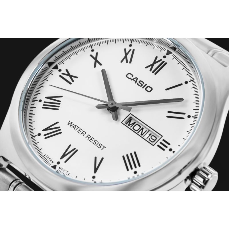 The Casio MTP-V006D is a model designed for those who value purity of lines and timeless design – devoid of unnecessary detail, yet with complete respect for classic style. The watch features a slim, 38mm case and a transparent dial with delicate hands and elegant Roman numeral indices. Designed around a timeless layout of hands – hour, minute, and seconds – it easily adapts to both everyday and more formal occasions. A functional date display at 3 o'clock complements this harmonious arrangement – discreet yet practical. The overall design exudes calm, order, and an aesthetic that speaks for itself. The steel bracelet gives the watch a refined character that looks great on a shirt cuff or with more casual attire – perfect for work, meetings, and everyday wear.