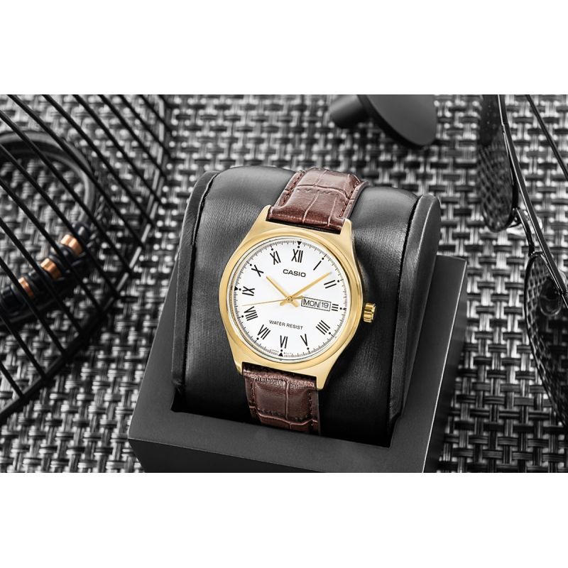 The Casio MTP-V006 is a model designed for those who value purity of lines and timeless design – devoid of unnecessary detail, yet with complete respect for classic style. The watch features a slim, 38-mm case and a transparent dial with delicate hands and elegant Roman numeral indices. Designed around a timeless layout of hands – hour, minute, and seconds – it easily adapts to both everyday and more formal occasions. A functional date display at 3 o'clock complements this harmonious arrangement – discreet yet practical. The gold-tone case adds a refined touch, while the brown crocodile-patterned strap perfectly complements an elegant style. Whether you wear it with a suit or a semi-formal shirt, this watch always looks classy.