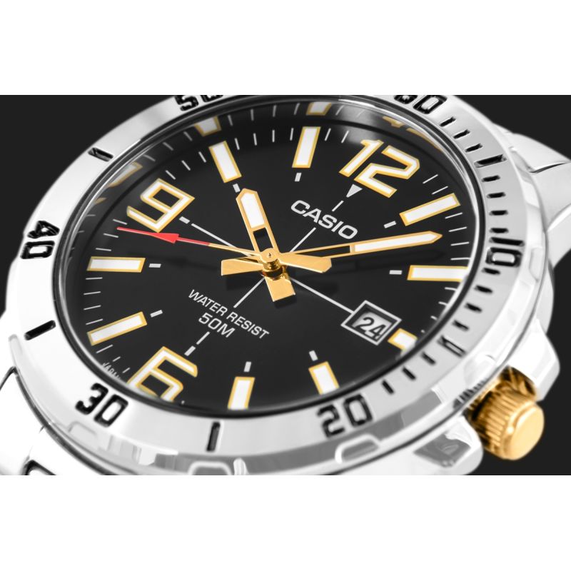 This men's CASIO model stands out for its distinctive, dynamic design and robust 44mm stainless steel case. The black dial, combined with gold indices, chunky hands, and details, creates an elegant contrast that emphasizes its modern, masculine character. The hour markers and hands are coated with a luminescent coating, ensuring readability regardless of lighting conditions. At the three o'clock position, a date display in a classic bezel not only enhances functionality but also emphasizes the balance of the design. A gold and silver stainless steel bracelet with an elegant gold-tone center band perfectly complements the design, ensuring comfort and a prestigious look. Water resistance of 50 meters means the watch is suitable for both everyday wear and spontaneous activities.
