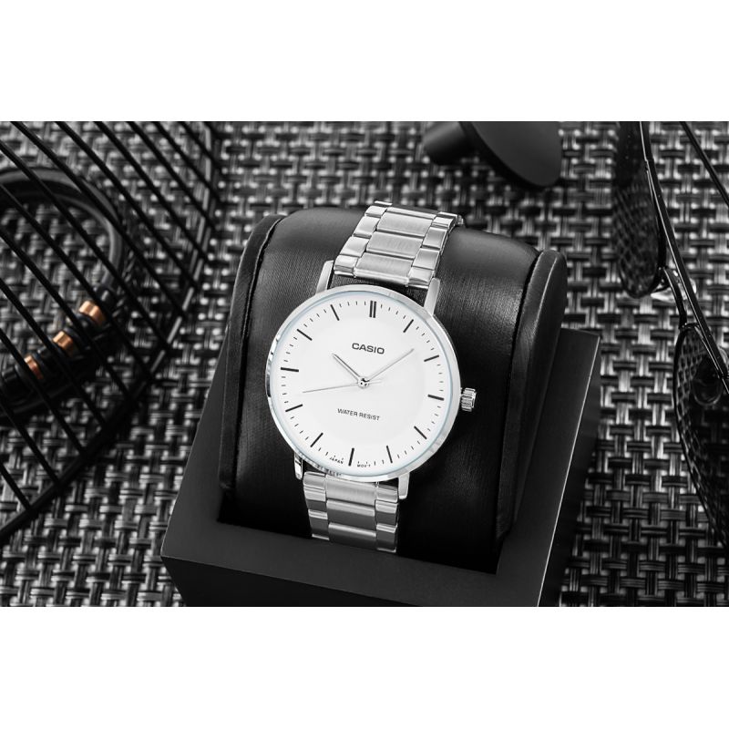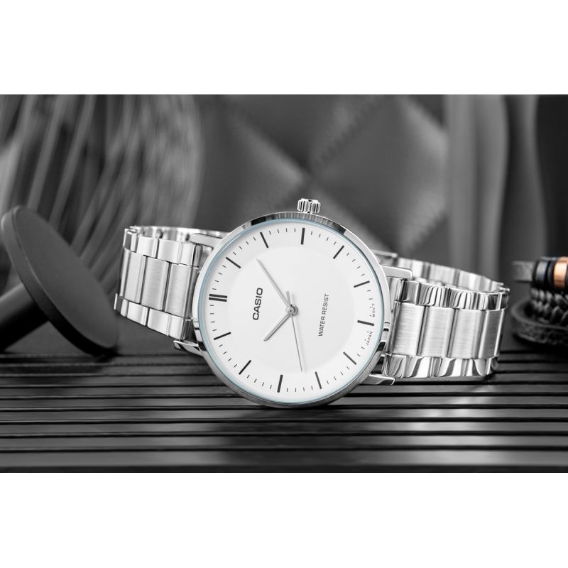 The MTP-VT04D is a tribute to pure design – without distractions, without complications, without noise. Just you and the time – read from a perfectly balanced dial, where every line has meaning, and every second flows in the rhythm of simplicity. No numerals? It's not a lack – it's a choice. No date? Likewise. Everything superfluous has disappeared, leaving only the essentials. Readability. Balance. Serenity. The matte-textured dial surface further enhances the overall look with a modern, minimalist feel. This watch adapts to you, not the other way around. It will fit perfectly under a jacket cuff or with your favorite T-shirt. The watch is thin (8.5 mm) and lightweight (90 g), making it comfortable and ready to be with you every day – not dominating, but complementing.