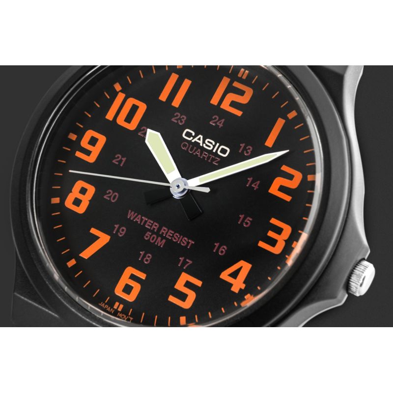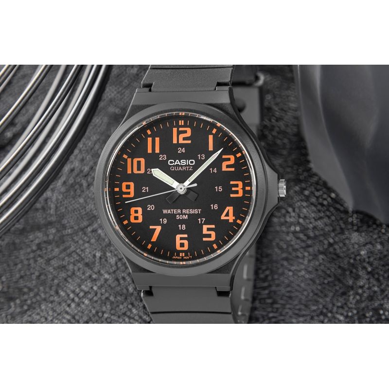 The CASIO MW-240 men's watch combines minimalism, functionality, and comfort in a masculine design. The watch's lightweight construction (just 35g!) makes it almost unnoticeable on the wrist. The flexible, matte resin strap adapts to your movements, is wear-resistant, and ready for any situation – from meetings to training. Large, legible numerals and contrasting hands with a fluorescent coating allow you to check the time at a glance, regardless of lighting conditions. Durable Resin Glass ensures resistance to everyday wear, while 5 bar water resistance ensures that splashes, rain, or a quick shower won't be a problem.