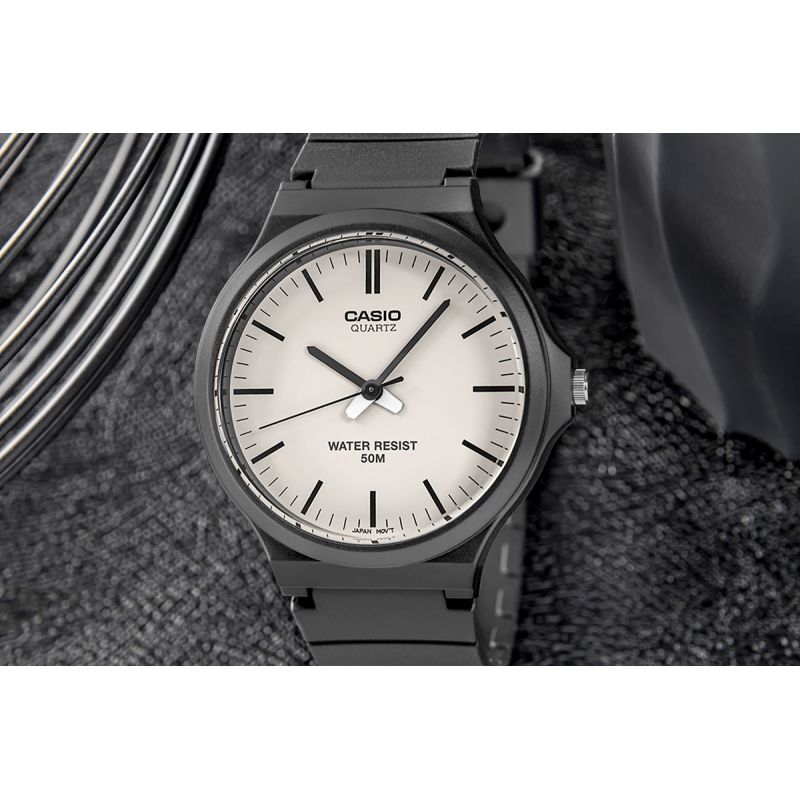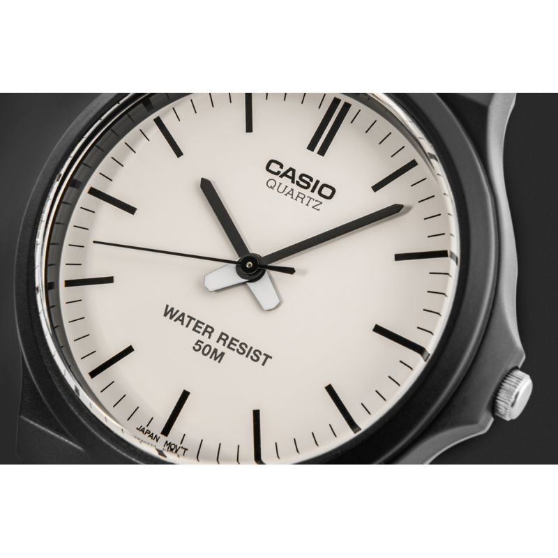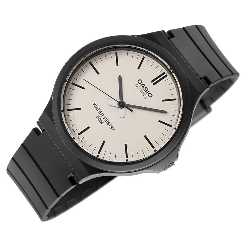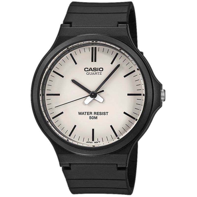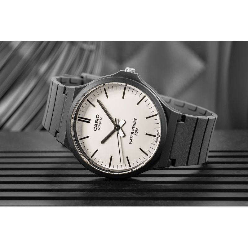 The CASIO MW-240 men's watch combines minimalism, functionality, and comfort in a masculine design. The watch's lightweight construction (just 35g!) makes it almost unnoticeable on the wrist. The flexible, matte resin strap adapts to your movements, is wear-resistant, and ready for any situation – from meetings to training. Large, contrasting indices allow you to check the time at a glance. Durable Resin Glass ensures resistance to everyday wear, while 5-bar water resistance ensures that splashes, rain, or a quick shower won't be a problem.