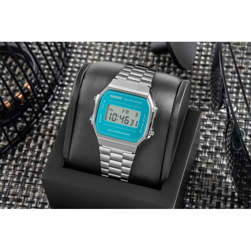 Not every watch can combine classic style with character, but this one does it effortlessly. The Casio A168WEM-2EF is a return to roots at its finest – simple, legible, with a mirror-finished turquoise dial that attracts attention without making a show of it. The chrome-plated case and matching steel bracelet create a cohesive whole – austere, elegant, and unassuming. This watch doesn't need trends. It set its own long ago. This model features standard digital timekeeping: hour, minute, second, time of day (PM), date, and day of the week. And when the moment comes, it has everything you need. A 1/100th-second stopwatch , split-time function, daily alarm, and hourly time signal – practical tools in a sleek design. In the evening, when the light fades, a single press is all it takes – the electroluminescent blue-green backlight illuminates the dial, giving it a unique atmosphere. The model is also splash-proof – because life doesn't ask if you have an umbrella.