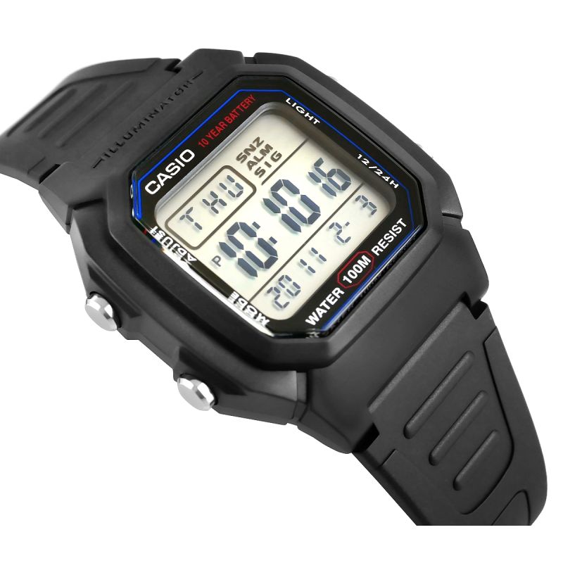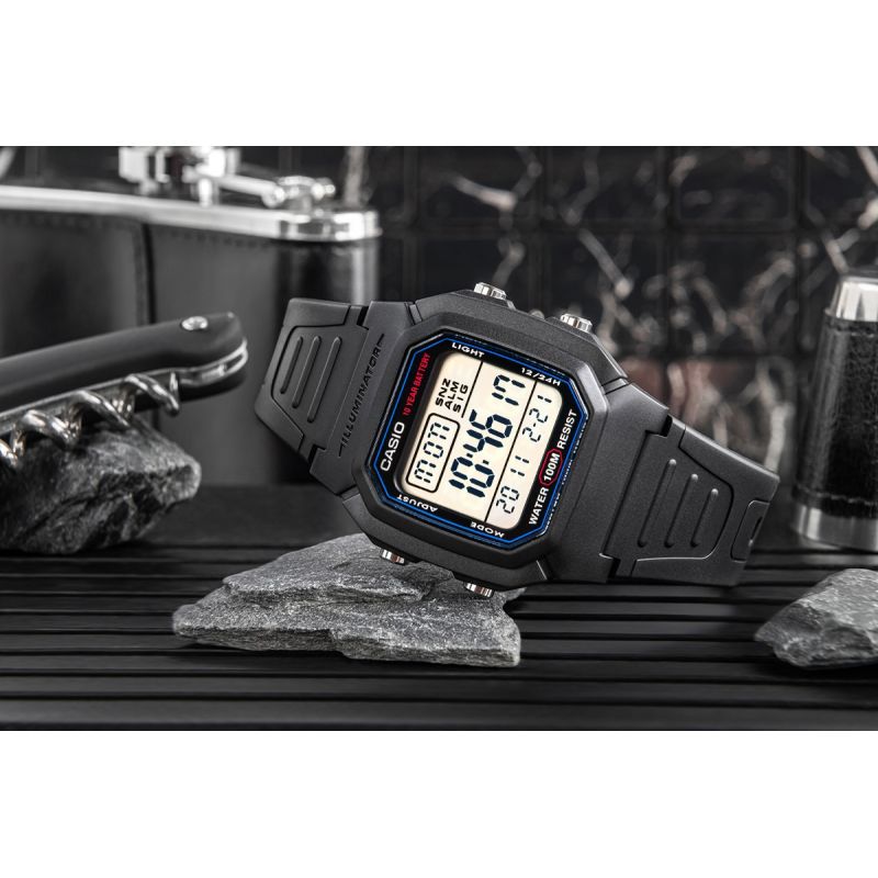 The Casio W-800H Men's Watch offers reliability in a clearer format – a modern digital watch with a large display that allows for quick and easy reading of the time. Equipped with water resistance to 100 meters, a 10-year battery life, LED backlighting, and other features, the watch offers all the most important information – time, date, and day of the week – in a large, easy-to-read format. With features like a 1/100-second stopwatch, dual time, and alarm with snooze, it's perfect for both training and travel. Durable LED backlighting with a glow effect ensures good visibility even after dark. The robust construction ensures durability in the urban jungle and during outdoor adventures.