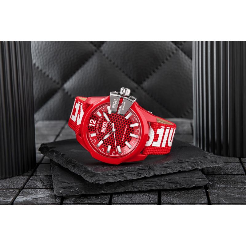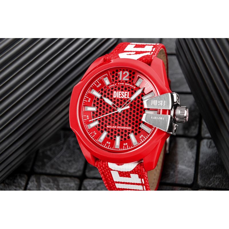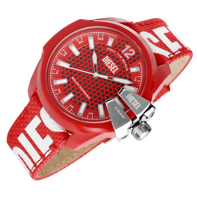 This striking and modern timepiece features a solar movement that draws its energy from light, eliminating the need for battery replacement. The intense red of the case and strap, complemented by white details, gives it a sporty and dynamic look. The unique perforated dial in a black and red motif with prominent indexes and the numeral 12 ensures easy readability. The strap, made of durable textile material and featuring a large, contrasting DIESEL logo, highlights the watch's streetwear style.