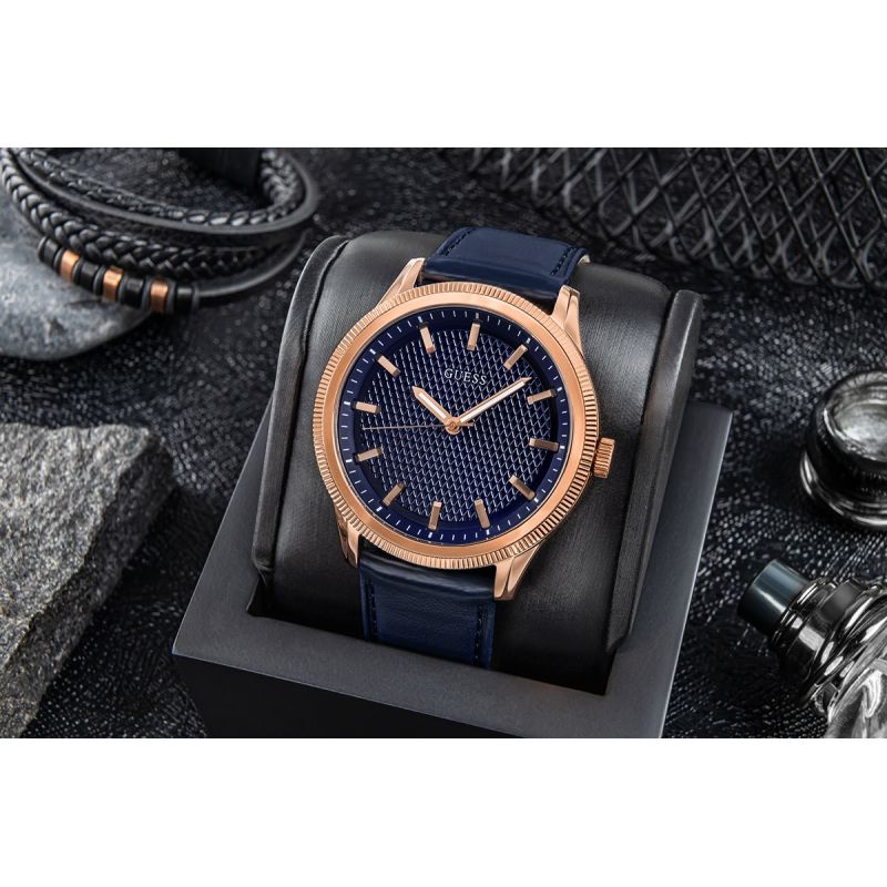 The Guess Dex GW0846G2 men's watch features an elegant strap crafted from high-quality genuine leather in a deep navy blue. Its subtle texture and softness ensure a perfect fit on the wrist, ensuring all-day comfort. The leather strap not only enhances the watch's luxurious character but also adds a touch of class, making it a perfect match for both an elegant suit and casual wear. The navy blue tone of the strap beautifully complements the rose gold-tone case and navy blue dial, creating a harmonious and expressive look. A sturdy clasp ensures security, while the durable leather guarantees durability and timeless style.
