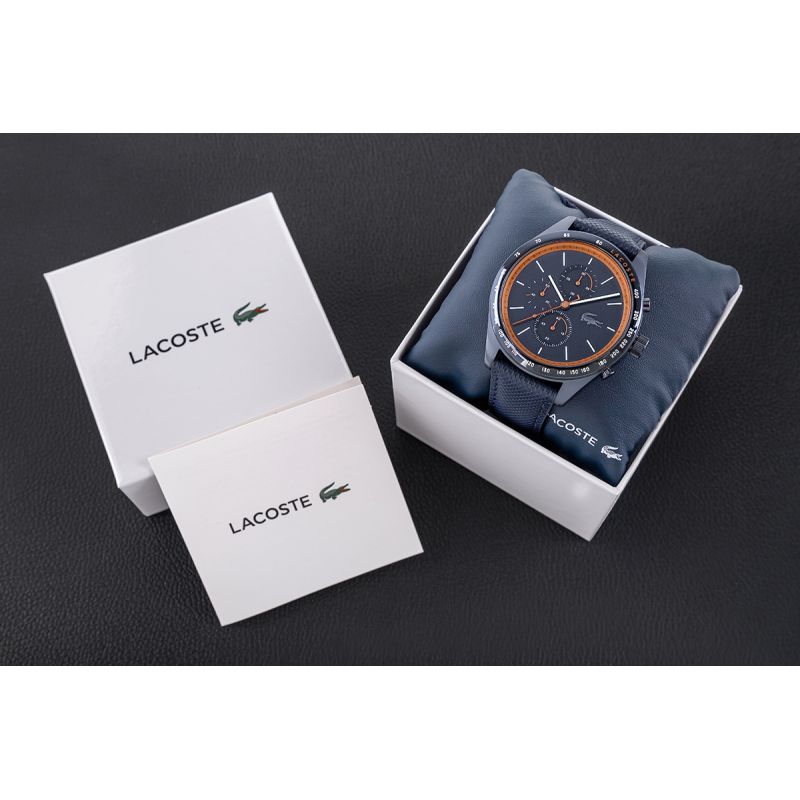 A quintessence of masculine strength and style, the deep navy blue dial, enclosed in a steel case, creates a stark, almost military backdrop. Bright orange accents pierce this dark landscape like a sudden burst of adrenaline, bringing energy and dynamism. The brushed texture of the dial adds depth, and the subtle Lacoste crocodile logo, embedded in the background, reminds us that this isn't just a watch—it's an expression of the brand's elegance and sporting spirit. The strap, with its carbon-inspired texture and dark navy blue shade, is a tough competitor—it perfectly complements the rest, ensuring durability and comfort in all conditions. The white indices on this watch are the real icing on the cake—expressive, sharp, as if precisely cut from a tough material. They contrast with the deep navy blue of the dial, conveying a sense of clarity and purity even in the most austere design. Their simplicity is strength—a reminder that time is always under control, and every second counts. This is a watch for the man who stops at nothing – expressive, strong, with character, just like you.