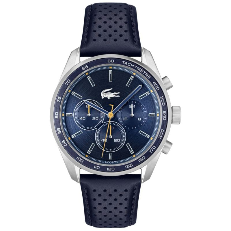 The silver case, strong and expressive, envelops the dial in a deep, metallic navy blue, as if straight from the ocean—elegance and dynamism in one. The indices and hands, in a cool combination of silver and navy, exude precision and confidence. And the seconds hand? This orange detail is a true statement—a statement of courage and energy that spurs you into action. A perforated navy blue leather strap, sturdy and stylish, rests on the wrist, fastened with a silver buckle, completing the ensemble like a perfectly matched buckle on a well-tailored suit. And the silver crown symbolizes control over time—for the man who doesn't let time rule him. The subtle Lacoste logo sits at the top of the dial, subtly reminding you of the prestigious brand without dominating the rest of the design.